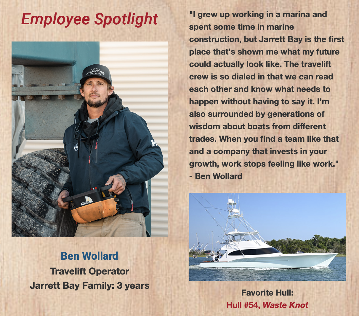 For this shoot, we produced a new episode of the Jarrett Bay Insider series, focusing on the massive Hull 68, a 90-foot sportfishing boat that is currently in production. We also conducted a few interviews with employees for the monthly employee spotlight series as well as shot portraits of them. Jarrett Bay boatworks uses these videos and images to keep their customers and fans engaged.